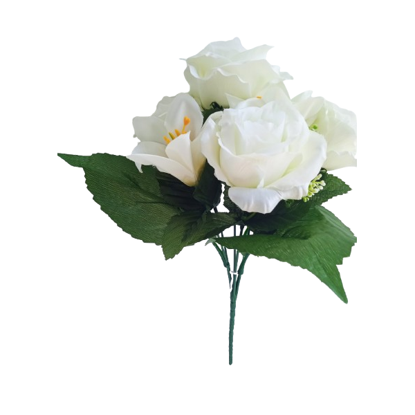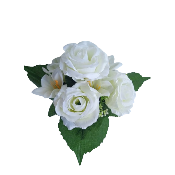 růže kytice x7 stonků (4x růže + 3x lilie), výška 32 cm; květ cca 9 cm
