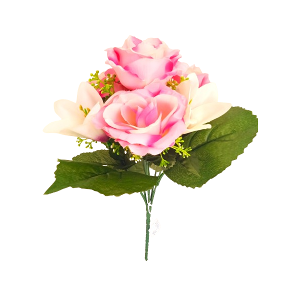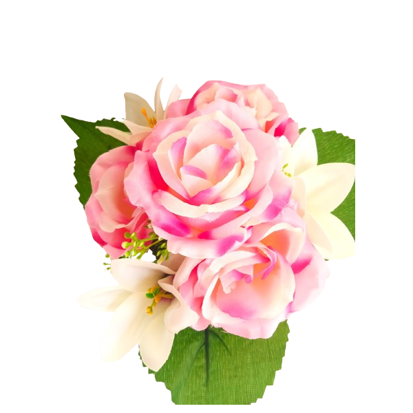 růže kytice x7 stonků (4x růže + 3x lilie), výška 32 cm; květ cca 9 cm