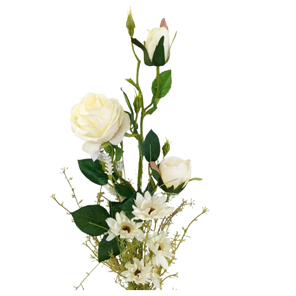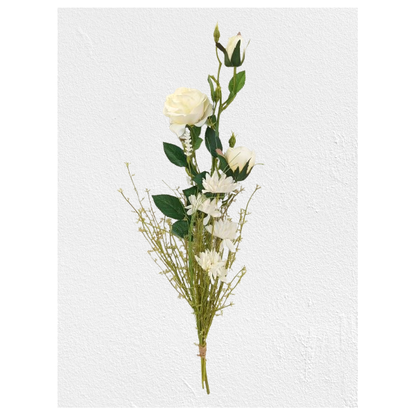 Umělá kytice bílé barvy, složená z 1 bílé růže (2 květy + 1 poupě), kopretiny a lučního kvítí; celkem 3 ks květin; v. 70 cm. Více viz popis..