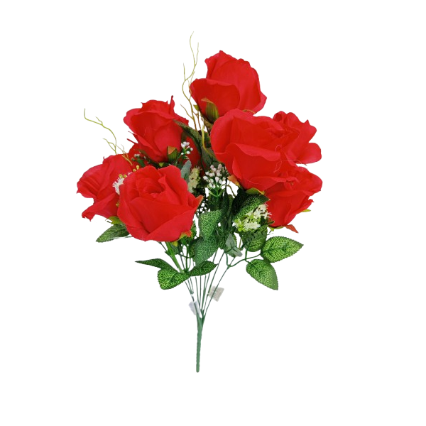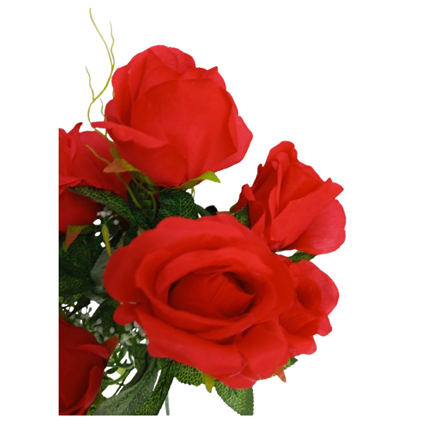 Kytice růže s přízdobou x 9 stonků/květů; v. 45 cm; materiál plast a textil. Pěkné.