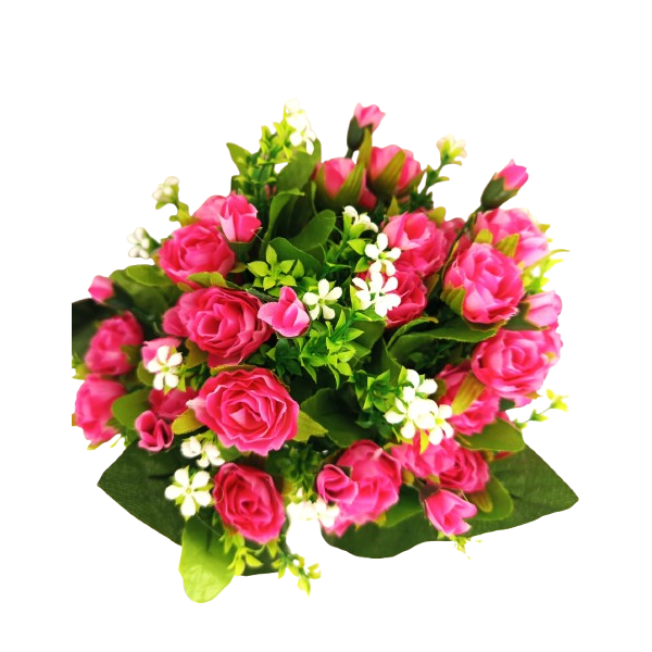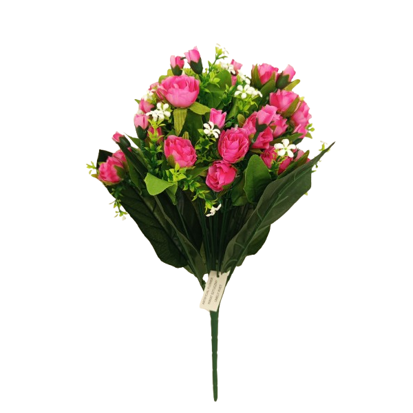 Růže - kytice poupat s přízdobou x 18 stonků; v. 44 cm; materiál plast a textil. Pěkné, bohatě kvetoucí.