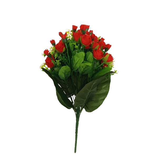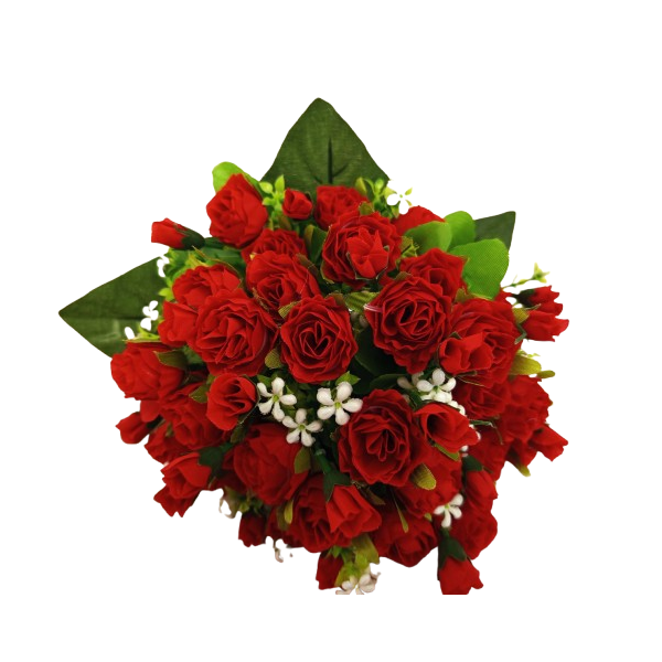 Růže - kytice poupat s přízdobou x 18 stonků; v. 44 cm; materiál plast a textil. Pěkné, bohatě kvetoucí.