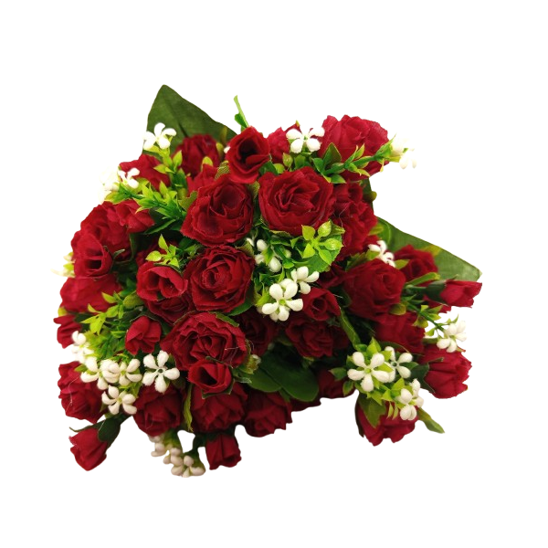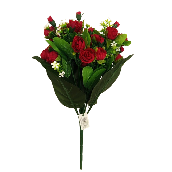 Růže - kytice poupat s přízdobou x 18 stonků; v. 44 cm; materiál plast a textil. Pěkné, bohatě kvetoucí.