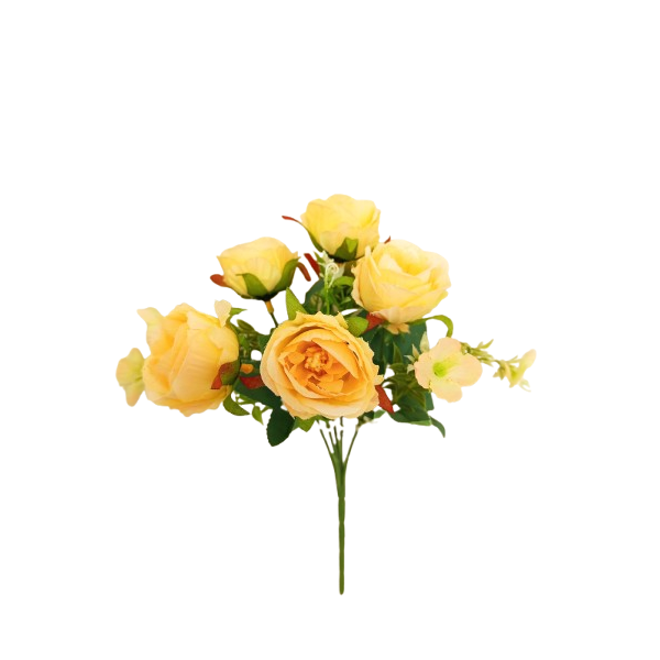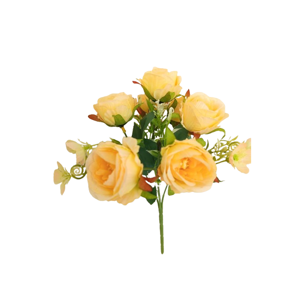 Růže - kytice s přízdobou x5 stonků; v. 27 cm; x7 květů 3x4,5 cm; materiál plast a textil. Pěkné, jemné a dekorativní.