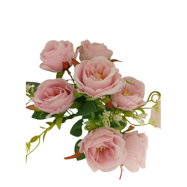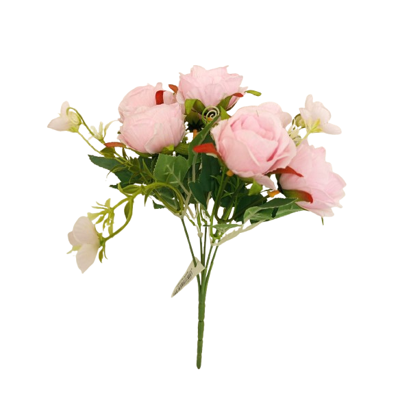 Růže - kytice s přízdobou x5 stonků; v. 27 cm; x7 květů 3x4,5 cm; materiál plast a textil. Pěkné, jemné a dekorativní.