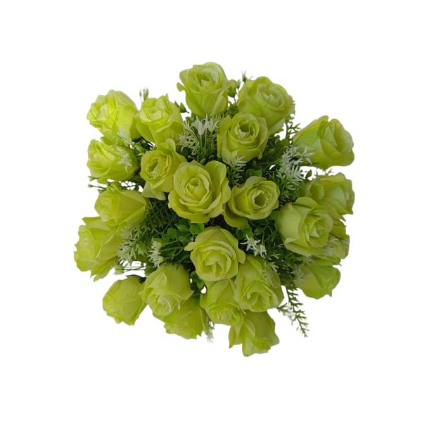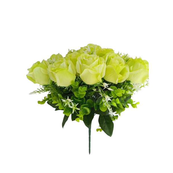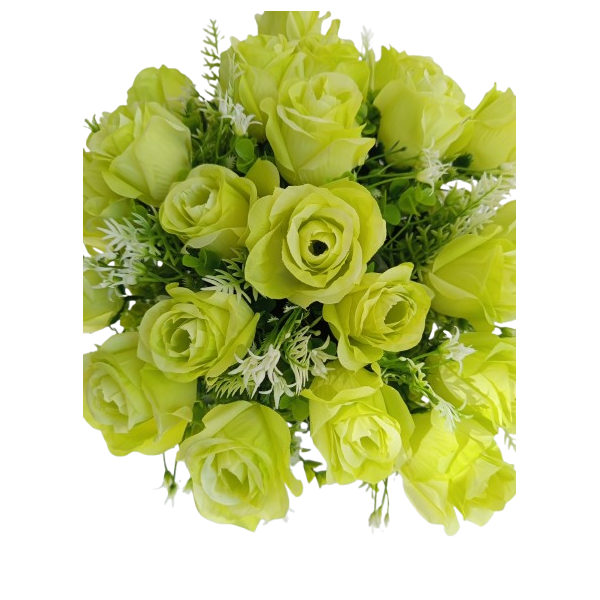 Kytice 24 květů růží s přízdobou, výška 39 cm, květ 5x6 cm, průměr kytice cca 30 cm. Krásná bohatě kvetoucí kytice.
