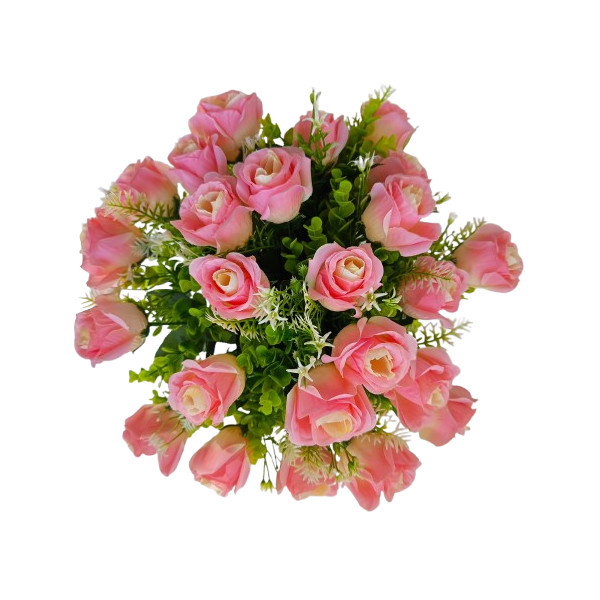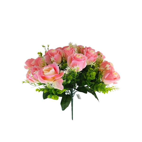 Kytice 24 květů růží s přízdobou, výška 39 cm, květ 5x6 cm, průměr kytice cca 30 cm. Krásná bohatě kvetoucí kytice.