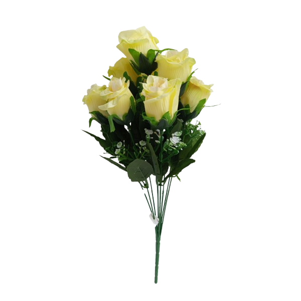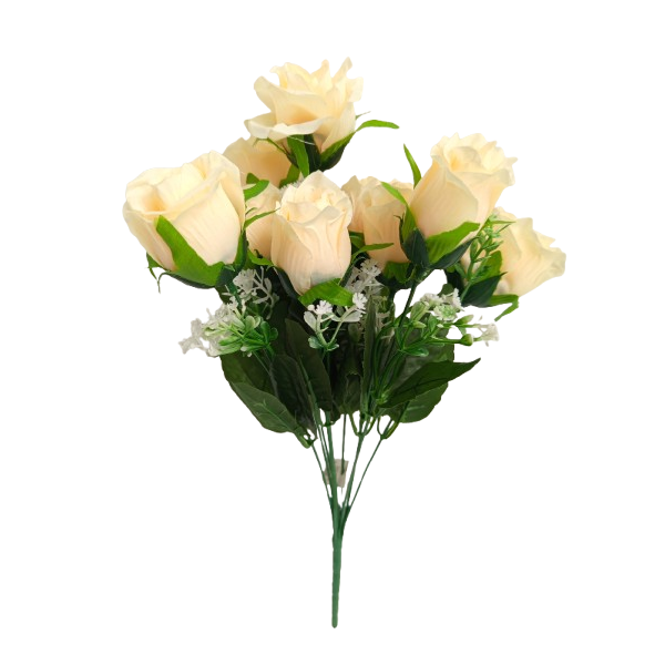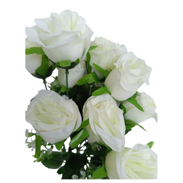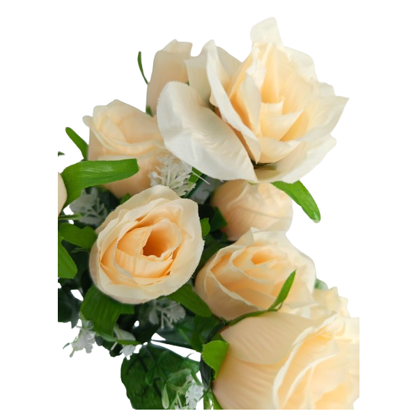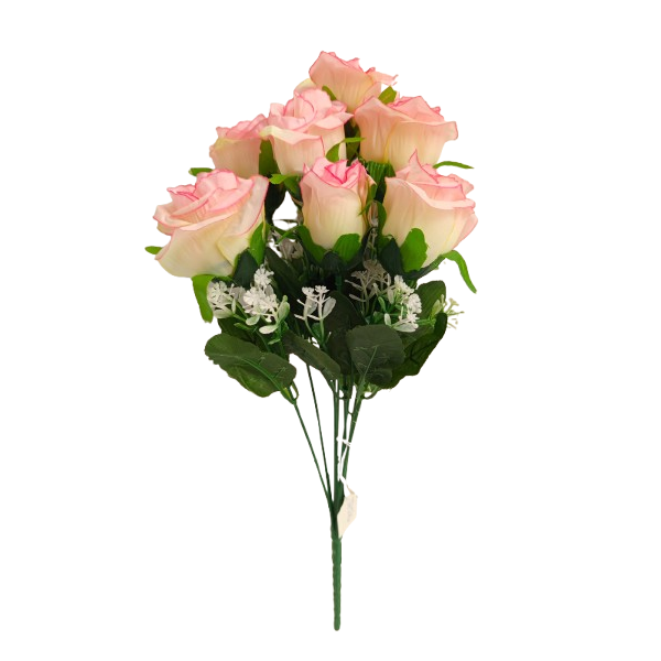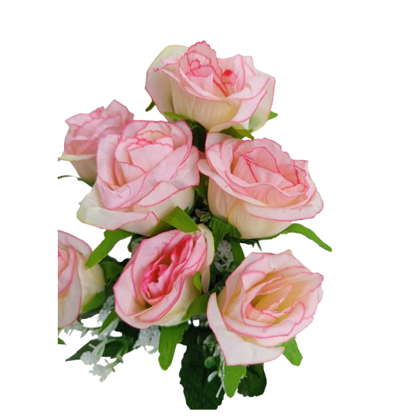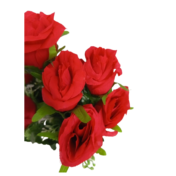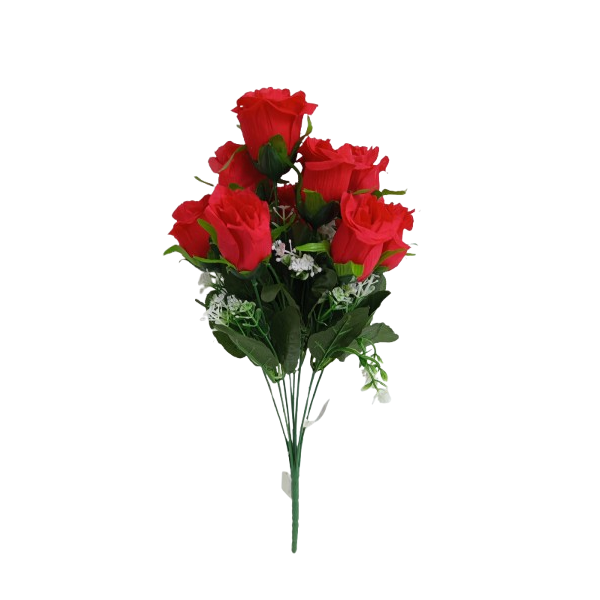 Kytice růže s přízdobou x 9 stonků/květů; v. 41 cm; materiál plast a textil. Pěkné.