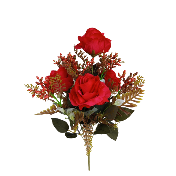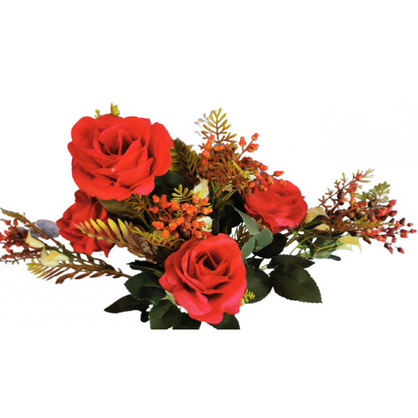 Kytice růže s přízdobou v podzimních tonech, 9 stonků; 4 květy růže; v. 48 cm, květ 8x7 cm. Pěkné