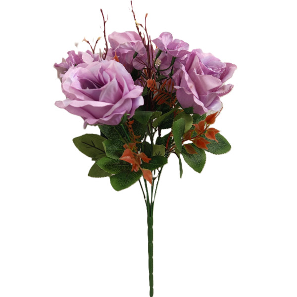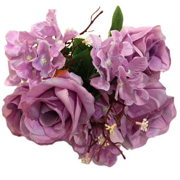 Kytice růže mix s hortenzií. Celkem 7 květů + přízdoba. Materiál je textil a plast. V. 46 cm; květy 8x7 cm. Moc pěkné. 6 barevných variant.
