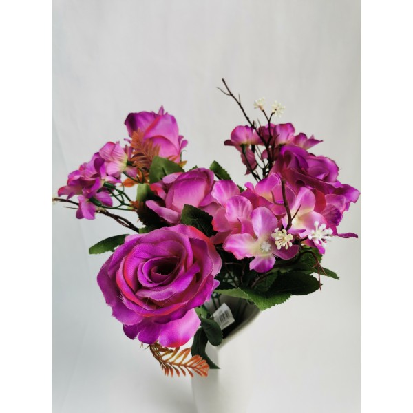Kytice růže mix s hortenzií. Celkem 7 květů + přízdoba. Materiál je textil a plast. V. 46 cm; květy 8x7 cm. Moc pěkné. 6 barevných variant.