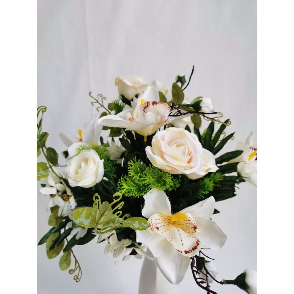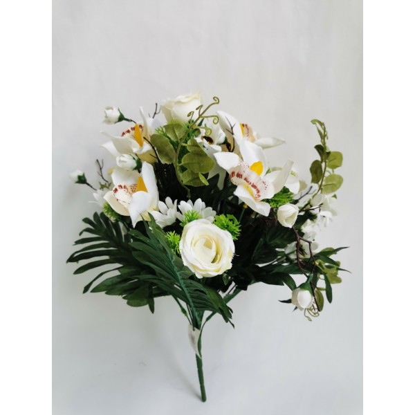 Kytice s palmovým listem - mix květin (růže, kopretina, orchidej) s přízdobou. V. 44 cm. Velmi bohaté.