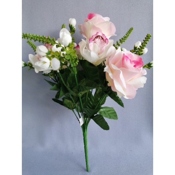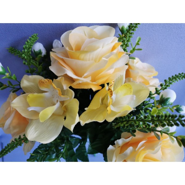 Kytice růže s orchidejí a přízdobou x 13 stonků. V. 40 cm, průměr květu růže je 11 cm. Nové zboží. 6 barev.