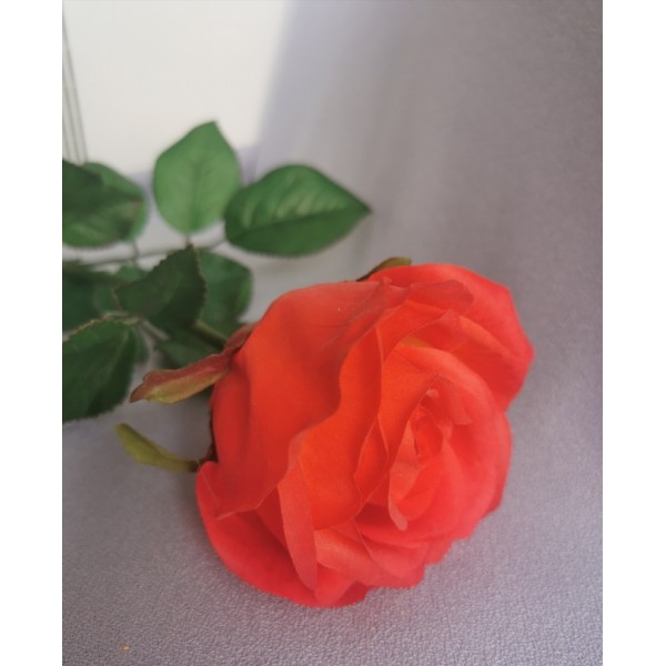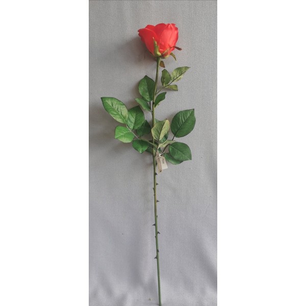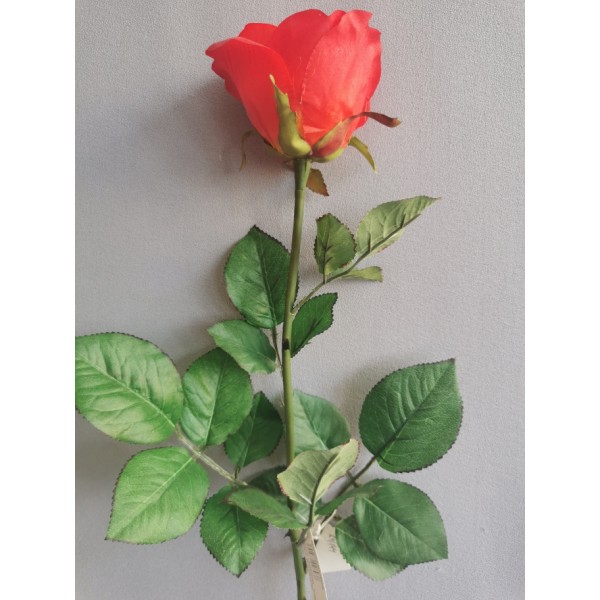 Krásná luxusní růže, pogumovaný květ; věrohodně zpracované listy; rozměry: v. 69 cm, květ 6*7 cm.