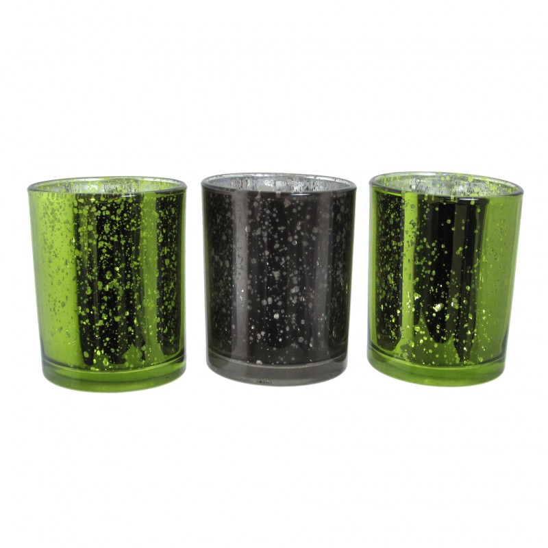 svícínek skleněný na čaj.svíčku, (box 3 ks), 2x ZELENÁ + 1x ŠEDÁ; rozměry: 6*7,5 cm; DOPRODEJ