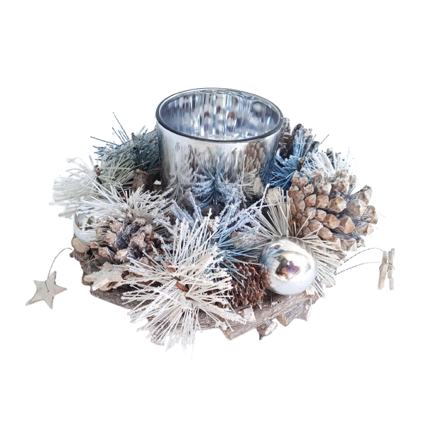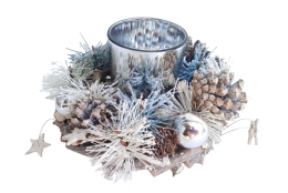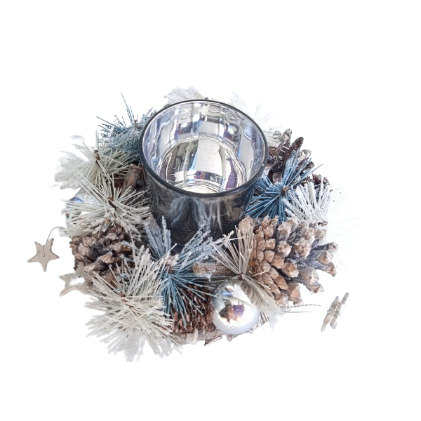 svícínek vánoční na svíčku (šišky, dřívka, plast.kouličky, chvojí, skleněná baňka 6,5*8 cm)
