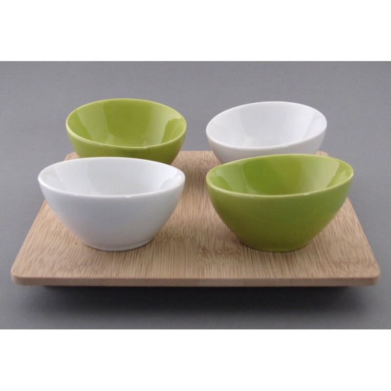 Tác z bambusu + 4 dipové misky z porcelánu