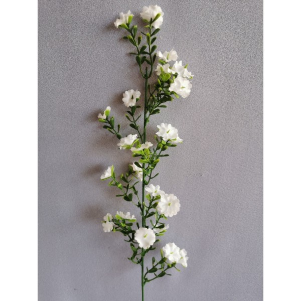 Větvička plastová s květy; větvička a lístky jsou plastové, květy textil. V. 57 cm. Opět naskladněny všechny barvy.