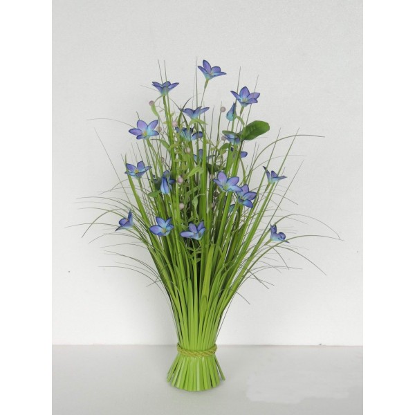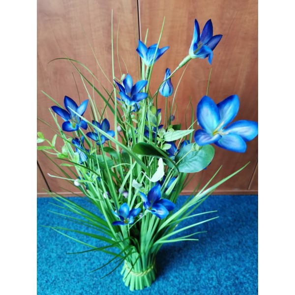 Kvetoucí dekorační tráva; v. 70 cm; modré květy + traviny + bobule. Květ tvar zvonku 7x3 cm. Moc pěkné.