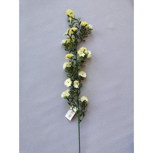 Větvička plastová s květy; větvička a lístky jsou plastové, květy textil. V. 57 cm. Opět naskladněny všechny barvy.
