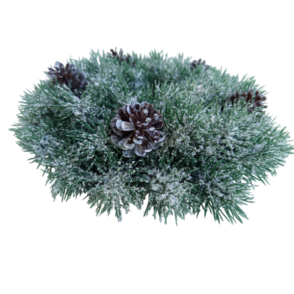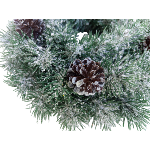 Věnec chvojový ojíněný s šiškami, průměr cca 28 cm. Materiál plast. Velmi pěkné provedení.