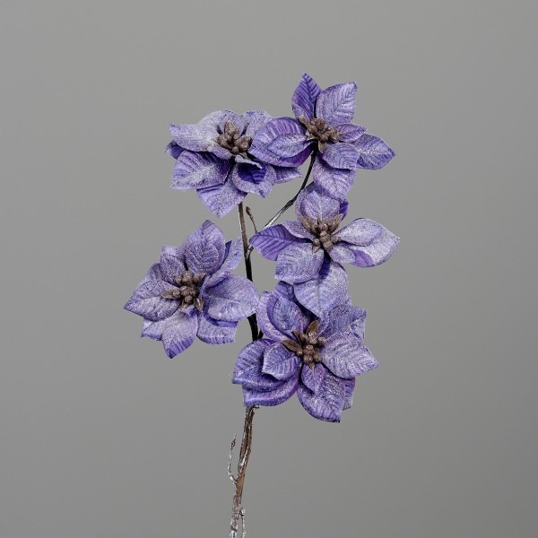 Poinsettie ledový vzhled s glitrem; v. 69 cm; květ 10 cm; barva fialovo-modrá.