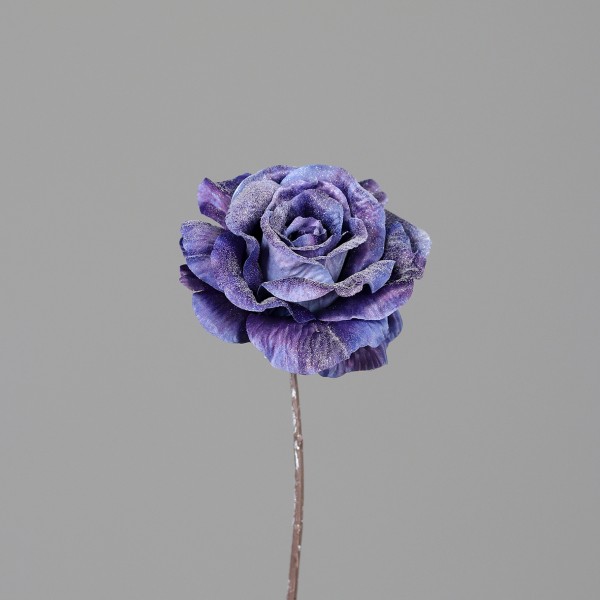 Růže ledový vzhled s glitrem; v. 45 cm; květ 12 cm; barva modro-fialová.
