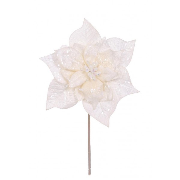 Poinsettie květ se stonkem, s glitrem, barva krém, v. 34 cm, květ 20 cm
