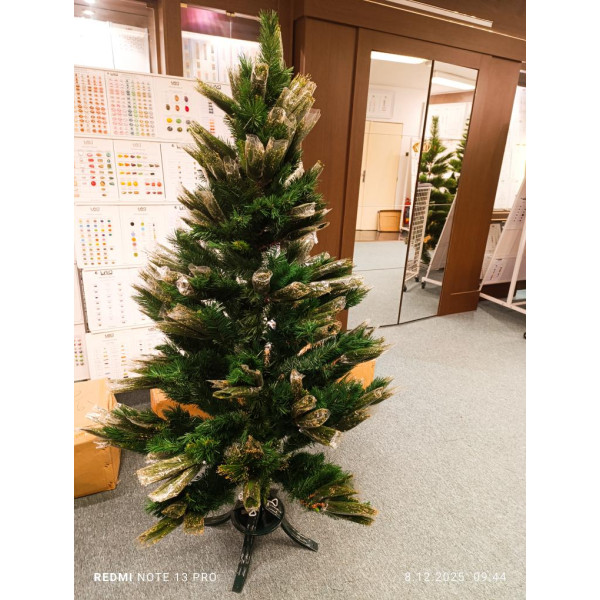 1 Vánoční umělý stromek borovice 165 cm - výprodej. Na koncích větivček jsou zlaté glitry, hezky to vypadá. Poslední kus.