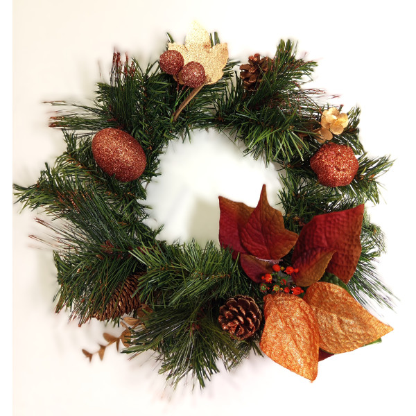 Věnec zdobený s hnědo-zlatou poisettií, pravými šiškami a bobulemi s glitry. Průměr 26 cm. Umělé jehličí borovice a smrk.