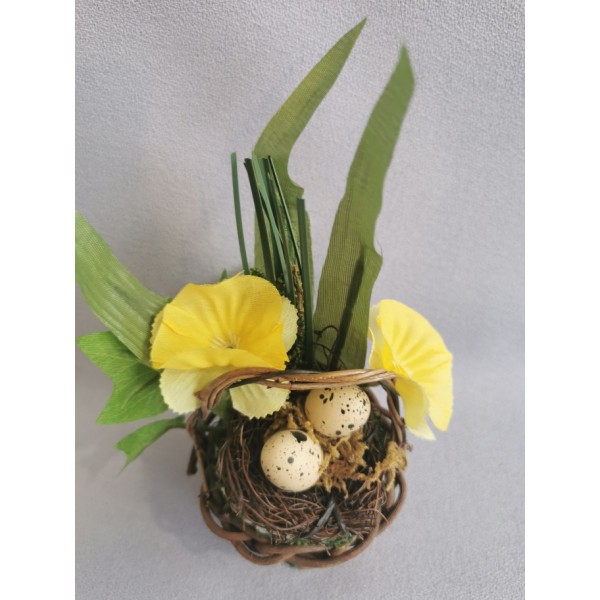 Jarní dekorace z proutí a umělých květin. Celková výška 16 cm. Průměr košíku je 7 cm.