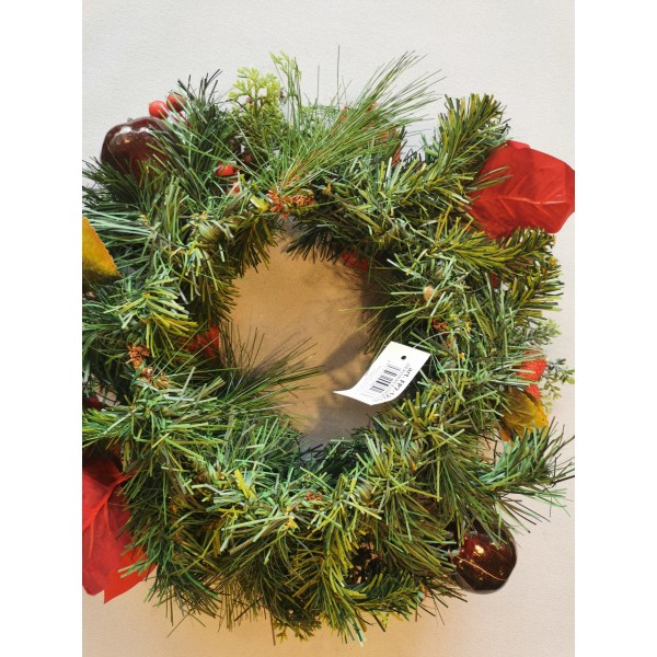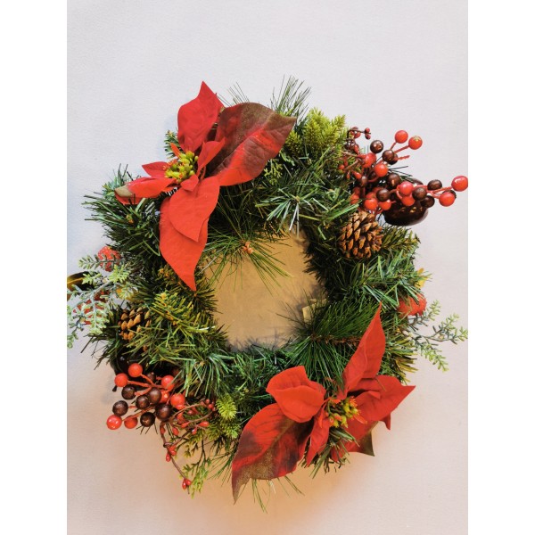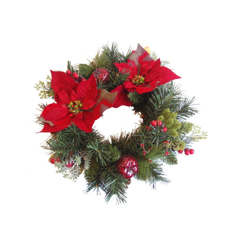 Věnec zdobený - pravé šišky, umělá jablíčka, bobule, květy poinsettie, aj.; vel.: průměr 40 cm; klasický vánoční věnec. VÝPRODEJ