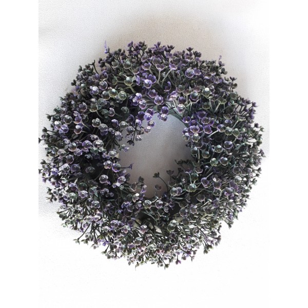 Věnec buxus; průměr 25 cm; barva tmavá zelená/fialová. Mat. plast.