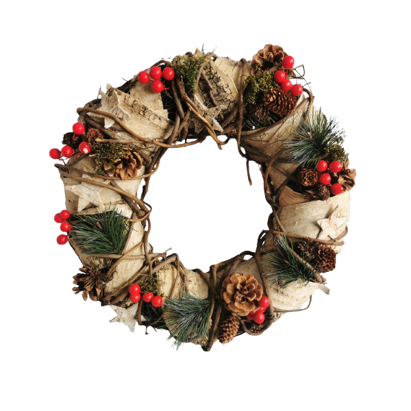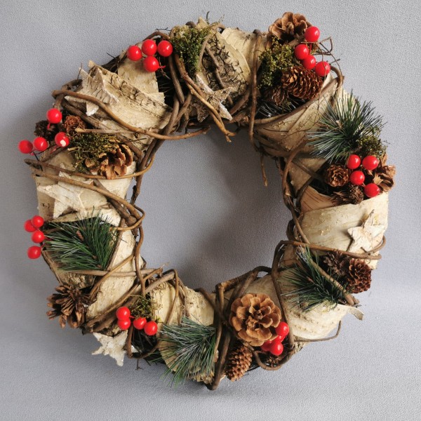 luxusní přírodní vánoční věnec z proutí, kůry, šišky a bobule; průměr 34 cm; umělé pouze jehličí a bobule