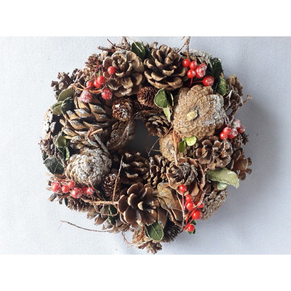 Věnec přírodní zdobený - se šiškami, bobulemi a lístky ...postříbřený stříbrným glitrem; průměr 26 cm. Vše až na bobule přírodní materiál. Z věnce materiál odpadává, je to již přesušené. PRODÁVÁME JAKO MATERIÁL. Dodáme vše co k věnci patří.