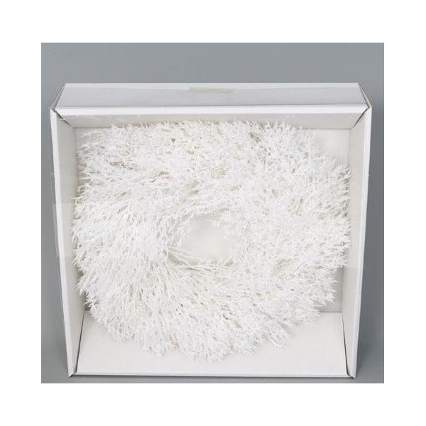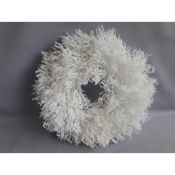 Věnec plastový bílý zasněžený s glitrem - typ tráva/ lišejník; průměr 30 cm; každý věnec má svou krabičku.