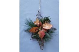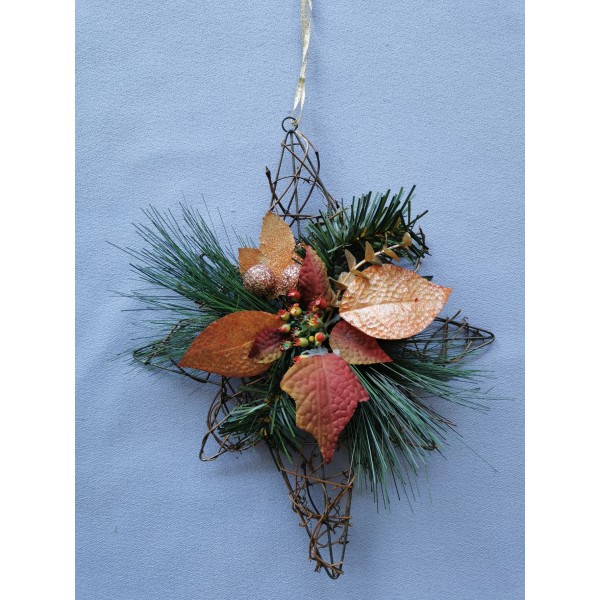 Závěsná dekorace s hnědo-zlatou poinsettií. Délka dekorace (bez provázku) je 30 cm.