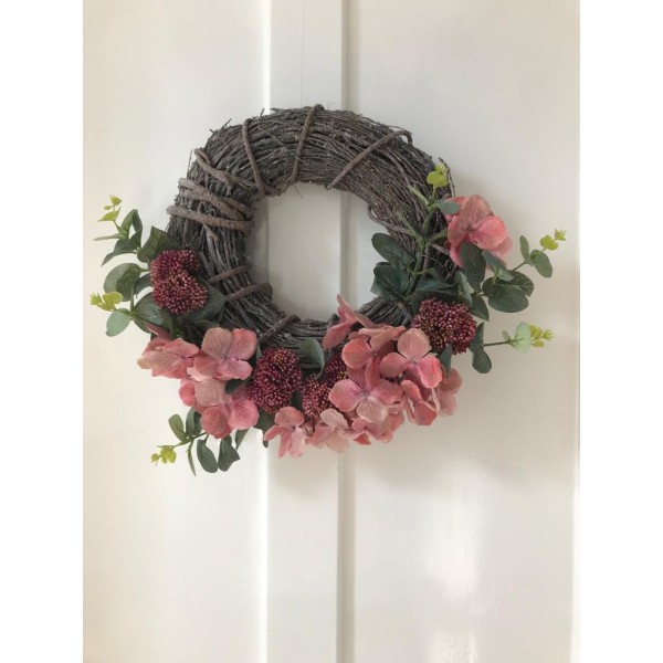 Luxusní věnec z přírodního proutí s starorůžovými květy posetými glitry a eukalyptem. Průměr 30 cm. Růžová mašle. Pouze 1 ks k dispozici.