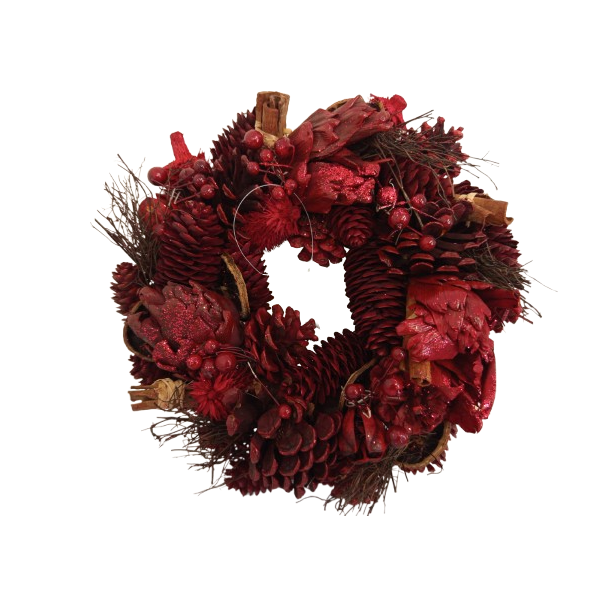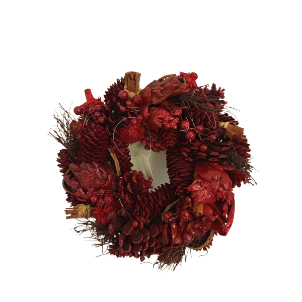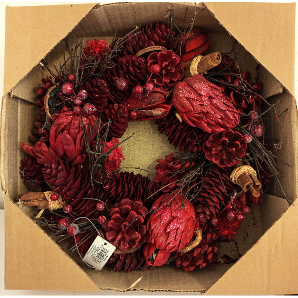 Přírodní věnec ....šišky, přírodní plody, skořice. Poseté glitry, laděné do červena. TOTÁLNÍ VÝPRODEJ