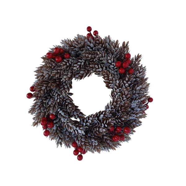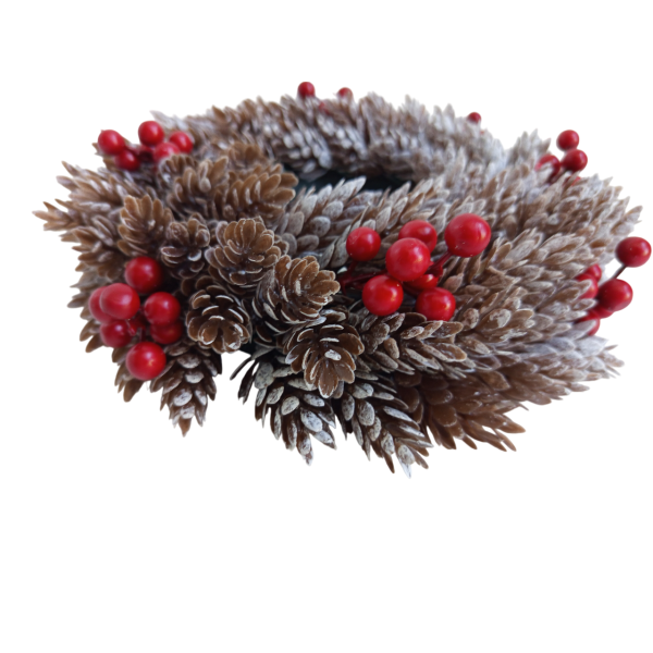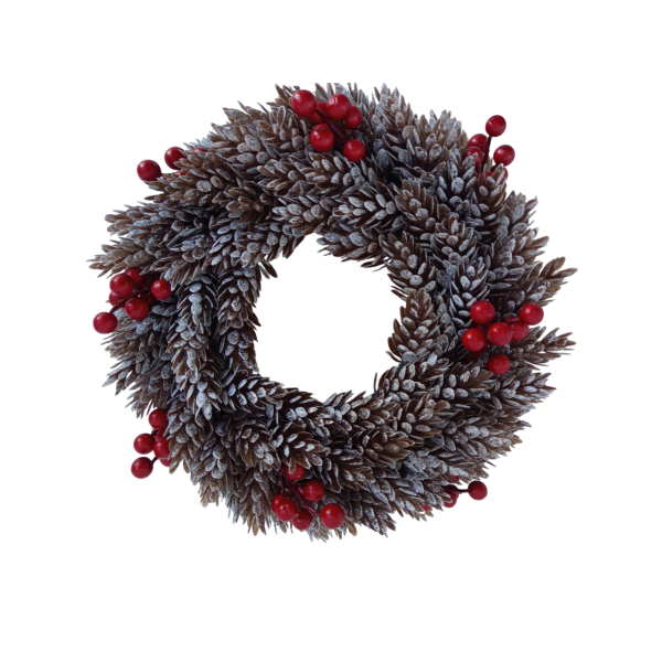 Věnec podzimní z šišek a červených bobulí, průměr cca 25 cm. Materiál plast. Velmi pěkné provedení.