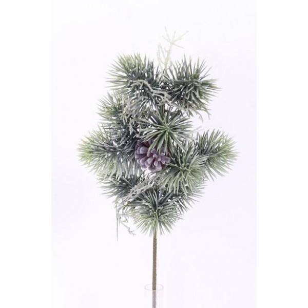 Větvička borovice s trávou a šiškou ojíněná. Materiál - vše plast. V. 46 cm. POSLEDNÍCH 6 KS.